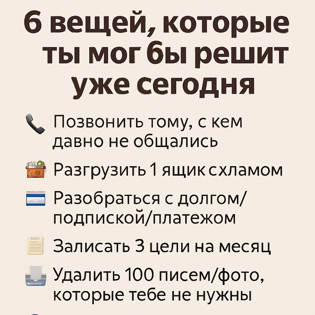 Ты удивишься, но многие большие проблемы в жизни решаются за 15 минут. Просто мы любим «думать», «планировать» и «готовиться»… вместо того, чтобы просто сделать. Вот 6 вещей, которые прямо сейчас висят у тебя в голове, и которые можно было бы решить уже сегодня. 1. 📞 Позвонить тому, с кем давно не общались Ты носишь в себе это “надо бы позвонить” уже месяцами. Но каждый день откладываешь. А потом может быть поздно. Серьёзно. Сделай это сегодня. 2. 🧺 Разгрузить 1 ящик с хламом Тот самый. В тумбочке. Где всё подряд. Ты удивишься, как 15 минут порядка в одном ящике дадут ощущение контроля над всей жизнью. 3. 💳 Разобраться с долгом/подпиской/платежом Ты знаешь, что где-то «висит»… но не проверяешь. И платишь лишнее. Зайди и проверь. Может, прямо сейчас сэкономишь деньги — или нервы. 4. 🗒 Записать 3 цели на месяц Они у тебя в голове… где-то… Но пока они не записаны — они просто шум. Потрать 5 минут и зафиксируй. Мозгу станет легче. 5. 📤 Удалить 100 пис