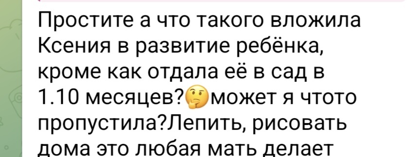 Ну, на постоянные шпильки про сад в 1.10 у меня иммунитет еще с 2023 года. До сих пор не понимаю, почему многих это так триггернуло тогда. Помню, у Леры был в группе там мальчик еще меньше нее (сад-то с 1.5), которого мама уводила утром и забирала вечером одновременно со мной одна из последних, только я бегом бежала на работу и с работы, а она приводила и забирала его с коляской с новорожденным... будь она блогером, ее б точно порвали как Тузик грелку и обвинили во всех грехах😃
