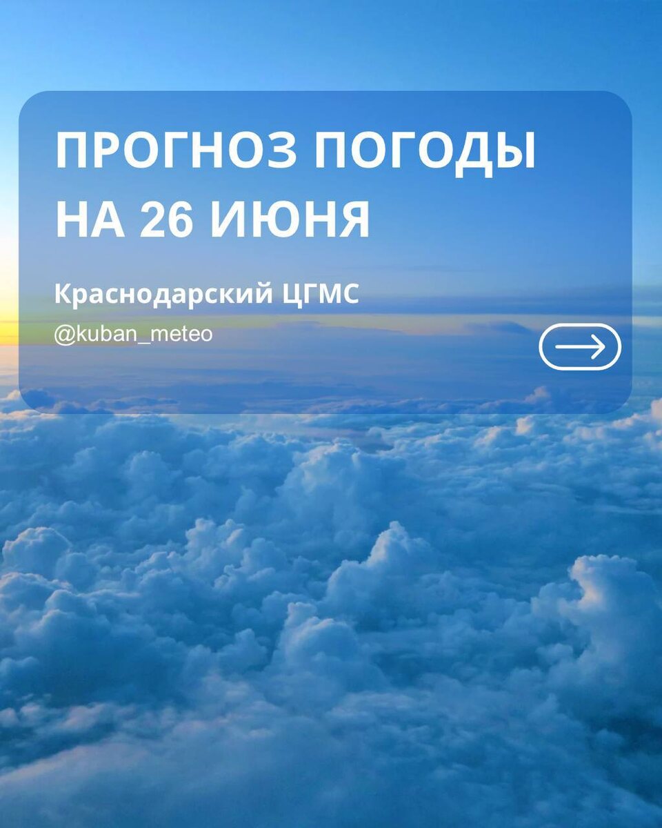 Прогноз на 26 июня. 🌊 На Черноморском побережье: Переменная облачность, без существенных осадков. 💨 Ветер южный, юго-западный 6–11 м/с, местами порывы до 15–18 м/с. 🌡 Температура воздуха ночью +14…+19°, днём +22…+27°. С заботой, Краснодарский ЦГМС @kuban_meteo 💙