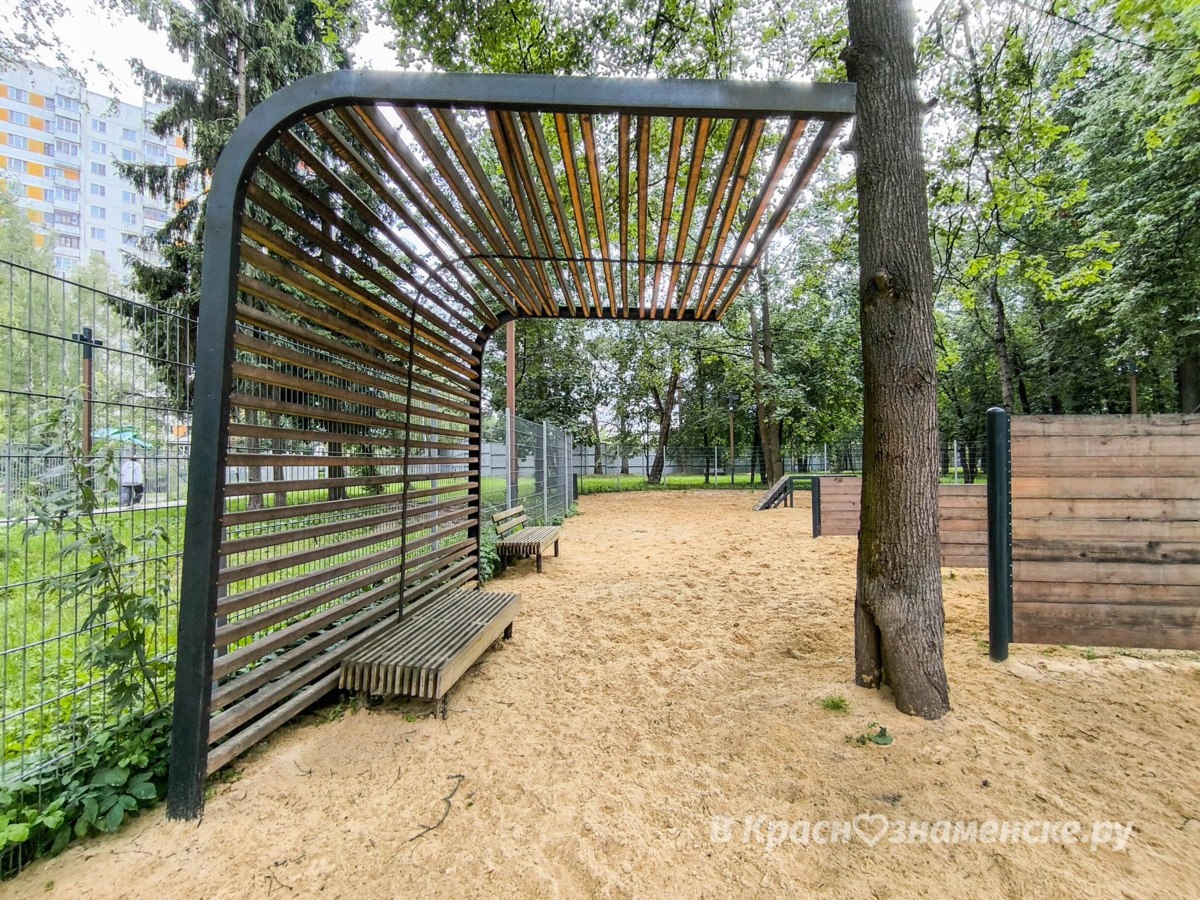 В начале месяца администрация обещала, что в парке Беличий на перголе на фудкорте появится баннерная ткань, а также, что будет предусмотрен монтаж дополнительных усилений и настил на Г-образных конструкциях на детской, спортивной и площадке для дрессировки собак.