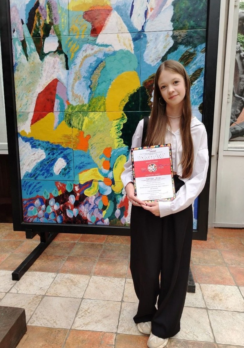 Анна Лаптева, ученица преподавателя Дарья Владимировна Зиновьева, стала обладательницей диплома Лауреата первой степени в номинации «Графика» среди участников возрастной группы 13–14 лет.