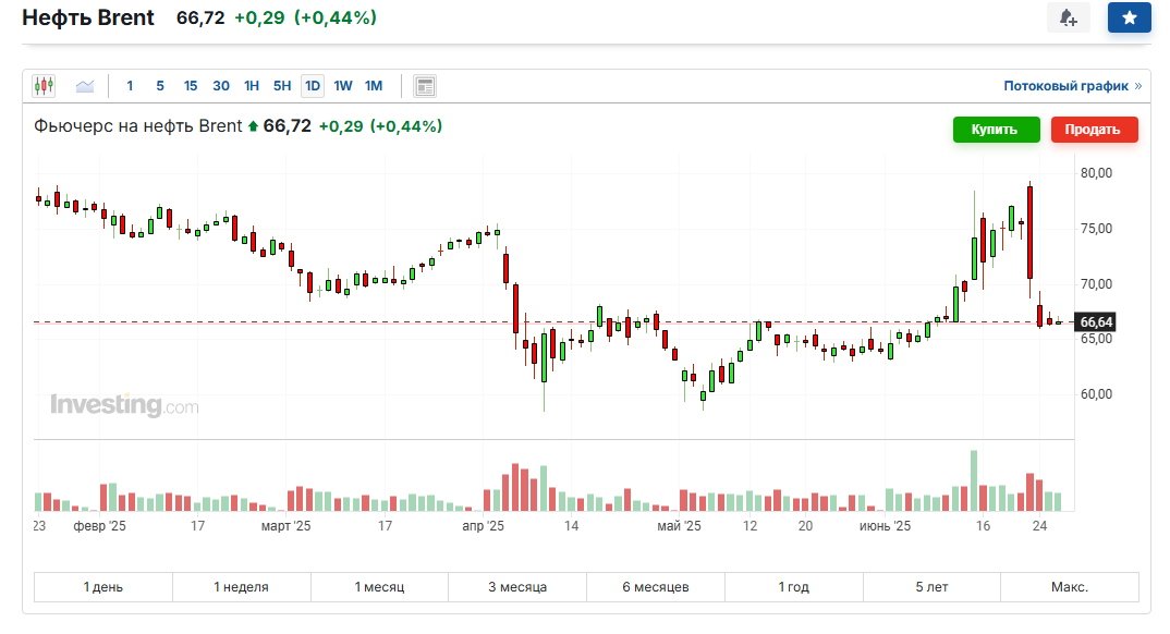 Рост на нефтяном рынке продолжался всего около 10 биржевых дней. Примерно столько же, сколько продолжались военные действия между Ираном и Израилем. После чего нефть рухнула еще более стремительно, чем до этого росла. Что мы сейчас можем констатировать... Чтобы подняться с 66 до 79 (максимум) долларов за баррель или почти на 20% эталонному сорту Brent потребовалось 10 дней. Чтобы упасть обратно до прежнего уровня 66 - всего 2 дня. Мои ожидания от цены на нефть на этот раз пока оправдываются довольно точно, и даже, я бы сказал, раньше срока. Несмотря на то, что это очень труднопрогнозируемый актив, почему так - тоже не раз объяснял. Я писал, что если цены и подскочат, то это будет временно, на короткий срок, а вот далее стоит ожидать ее падения, которое может уйти даже ниже тех уровней, где она была раньше. Подробно объяснял, почему: Главным ожиданием там было то, что с нанесением поражения Ирану исчезнут причины, послужившие поводом для наложения санкций на эту страну, после чего эти с