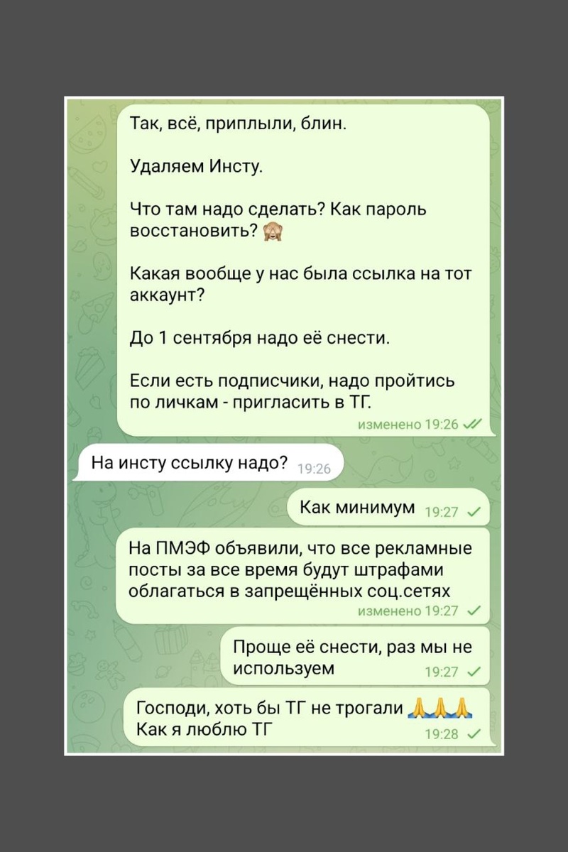 А у кого похожая переписка сейчас с помощниками/бизнес-ассистентами? 🙈 Что думаете? ❤️ - буду чистить запрещенку 📷💬 👍 - буду удалять аккаунты в запрещённых соц.сетях, чистить нереально 🙏 - Алёна, ты про что??? Я не в курсе 🙈 - я не веду аккаунты в запрещённых соц.сетях 😁 - а я вообще соц.сети не веду, бе-бе-бе #новость, #реклама, #ркн, #закон_о_рекламе