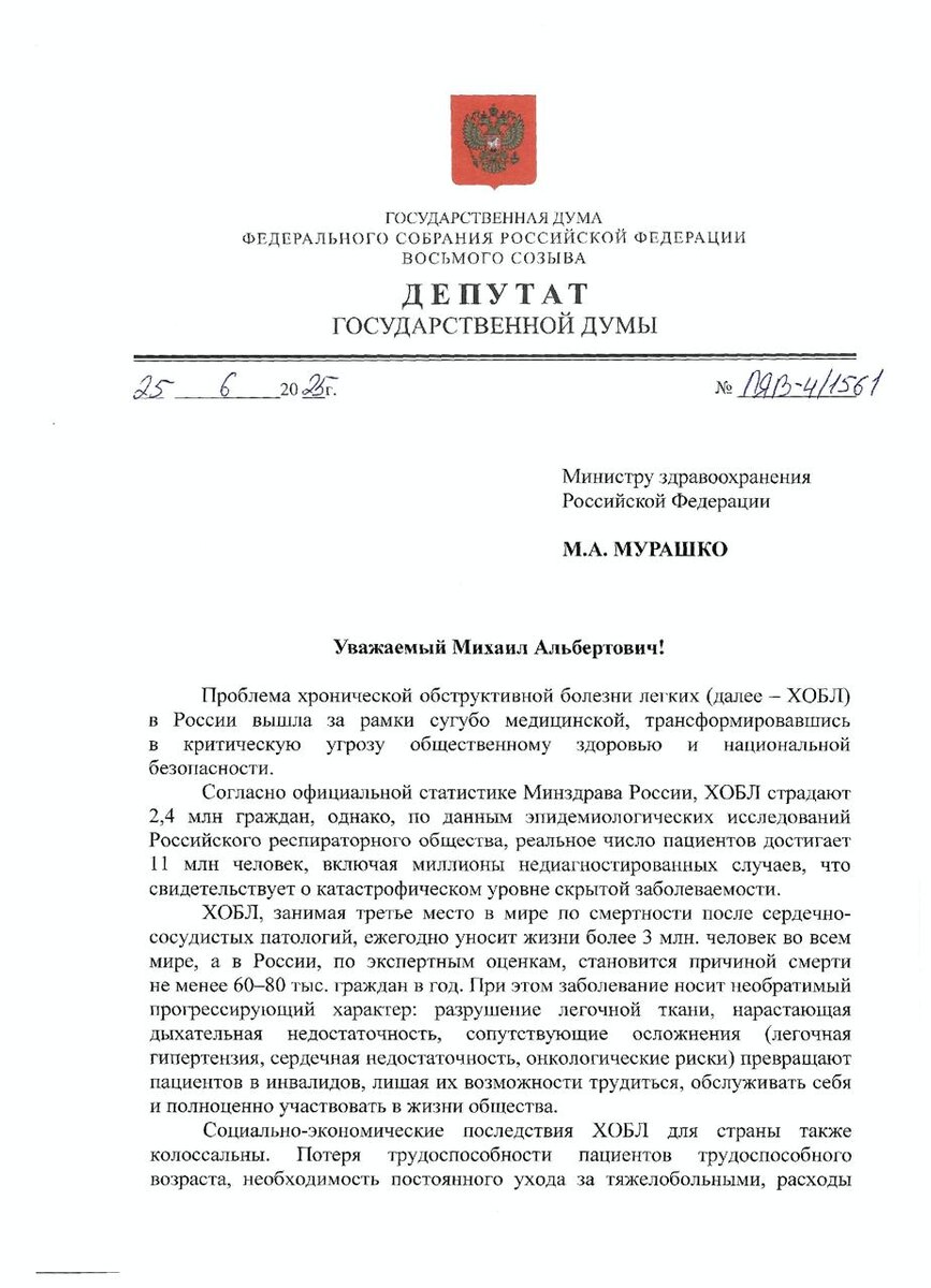 ⚡️ Мы предлагаем внести изменения в законодательство, чтобы пациенты с ХОБЛ могли получать необходимые лекарства бесплатно. Это не только облегчит финансовую нагрузку на семьи больных, но и поможет выявлять болезнь на ранних стадиях, когда её ещё можно контролировать. Зная, что есть возможность лечения, человек будет обращаться к врачу раньше, а значит, у нас появится шанс спасти его здоровье.