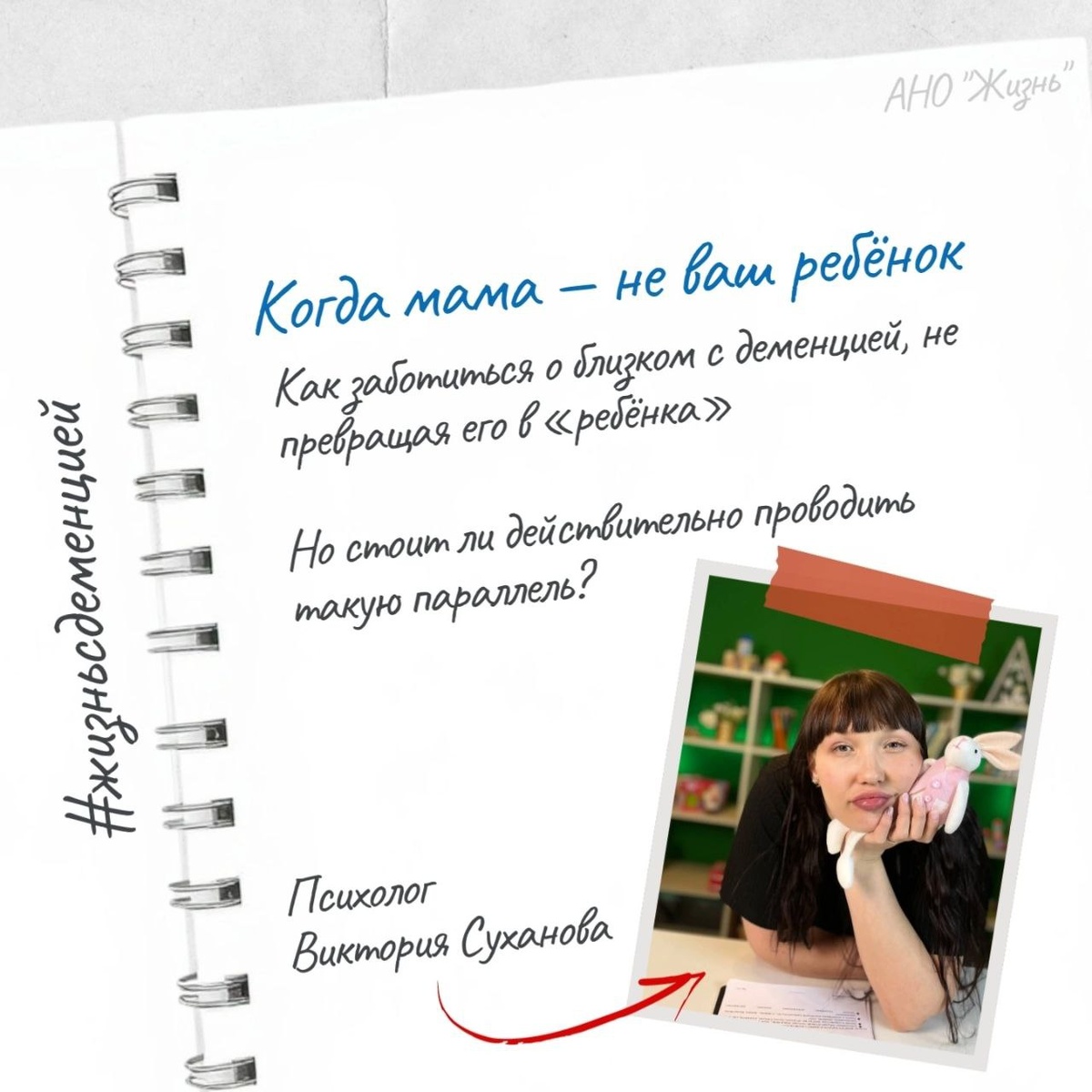 🔛Когда мама — не ваш ребёнок В нашем обществе нередко сравнивают пожилых людей с детьми. Особенно это заметно, когда речь идёт о людях с деменцией. В статьях и разговорах ухаживающих нередко звучит: « Теперь я для неё как мама», «Что мал, что стар», «Старики как дети». Но стоит ли действительно проводить такую параллель? ❌не про парентификацию Сначала важно уточнить: речь не идёт о парентификации — когда ребёнок становится «психологическим родителем» для своих родителей, беря на себя чрезмерную ответственность. Это — отдельная тема. Здесь мы говорим об уходе за пожилыми людьми с деменцией и о том, как важно не менять роли в семье: родитель остаётся родителем, даже если он болен. 🧩Почему поведение пожилого человека с деменцией может напоминать детское Когда человек теряет способность к самообслуживанию, ухаживающий начинает: * Принимать решения за него, * Готовить, кормить, помогать в гигиене, * Менять подгузники... Всё это действительно может напоминать уход за малышом. Но