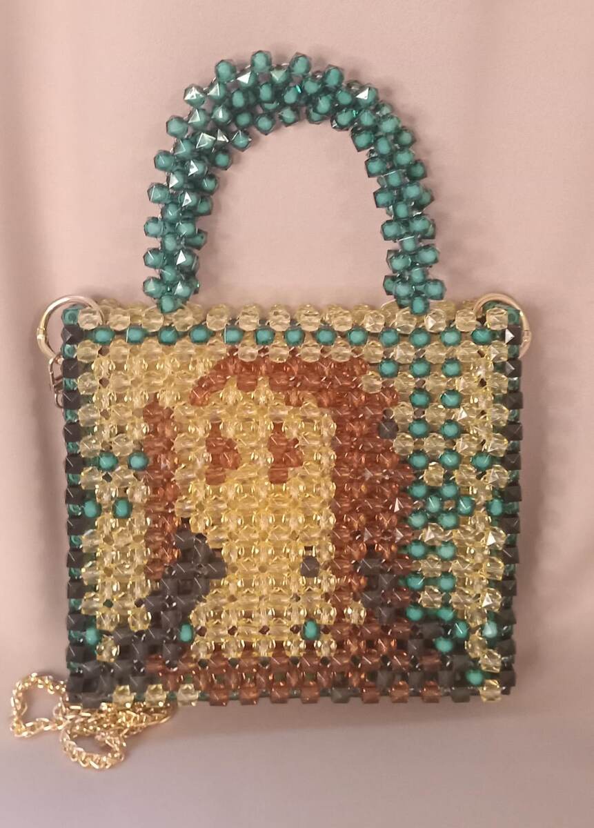 Сегодня я покажу мастер-класс по плетению вот такой сумочки! Для этого нам понадобится: -леска (рыболовная) -беж. бусинки (342 шт) -кор. бусинки (176 шт) -тёмн. кор. (64шт) -чёрн. (56 шт) -зел. (391 шт) Всего нам понадобится 1029 шт! Делаем 14 крестиков в длину! Крайний крестик делаем так, на
