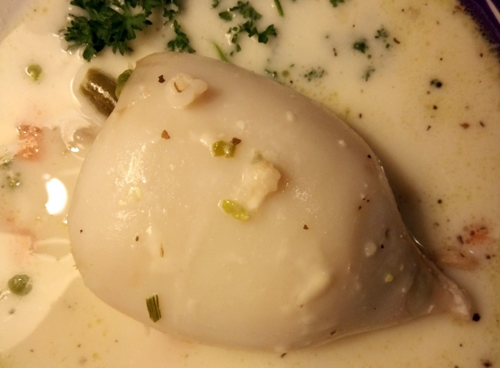 ✔ Кальмары (тушки) – 4 шт. (около 600 г); ✔ Шампиньоны – 200 г; ✔ Лук – 1 шт.; ✔ Замороженные овощи (стручковая фасоль + горошек) – 150 г; ✔ Масло растительное – 2 ст. л. (для жарки). Для соуса: ✔ Плавленый сыр «Дружба» – 1 шт. (100 г); ✔ Вода (можно молоко) – 150 мл; ✔ Сушёная зелень (петрушка, укроп) – 1 ч. л.; ✔ Соль, перец – по вкусу. Лук порезала и немного обжарила. Добавила шампиньоны, каплю воды и все вместе потушила еще минут 10. К грибам с луком добавила замороженные овощи (у меня была зеленая стручковая фасоль и горошек). Еще 10 минут. Посолила. Все. Начинка готова. Кальмары окатила кипятком. Нафаршировала подготовленной начинкой. Для соуса распустила в кипятке один плавленый сырок «Дружба», посолила, добавила немного сушеной зелени. Подготовленные кальмары положила в форму для запекания, залила соусом. Побоялась что кальмар сверху подсохнет поэтому закрыла все фольгой. Поставила в разогретую духовку на 15 минут. Кальмары получились очень мягкими! КБЖУ на 100 г - 137/17,2/9,8