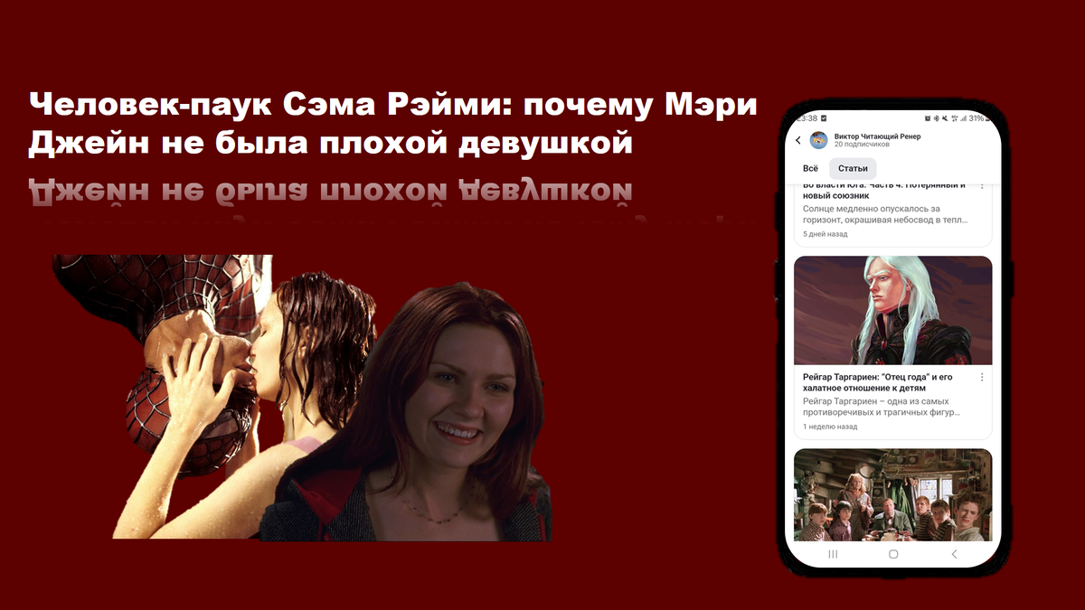 Мне нравится Мэри Джейн из фильмов Сэма Рейми. Она живая, настоящая. Со своими минусами и плюсами. Она не лезет в бой, но при этом о ней можно сказать гораздо больше, чем о последующих девушках Человека- паука. Мы знаем её мечты, знаем её предысторию, знаем что у неё хватает храбрости не мириться с плохим отношением ( уход из семьи, разрыв с парнем- хулиганом). Ей сострадаешь, когда у неё перестаёт получаться. Поэтому я считаю, что появившийся хейта в сторону этого персонажа не оправдан.