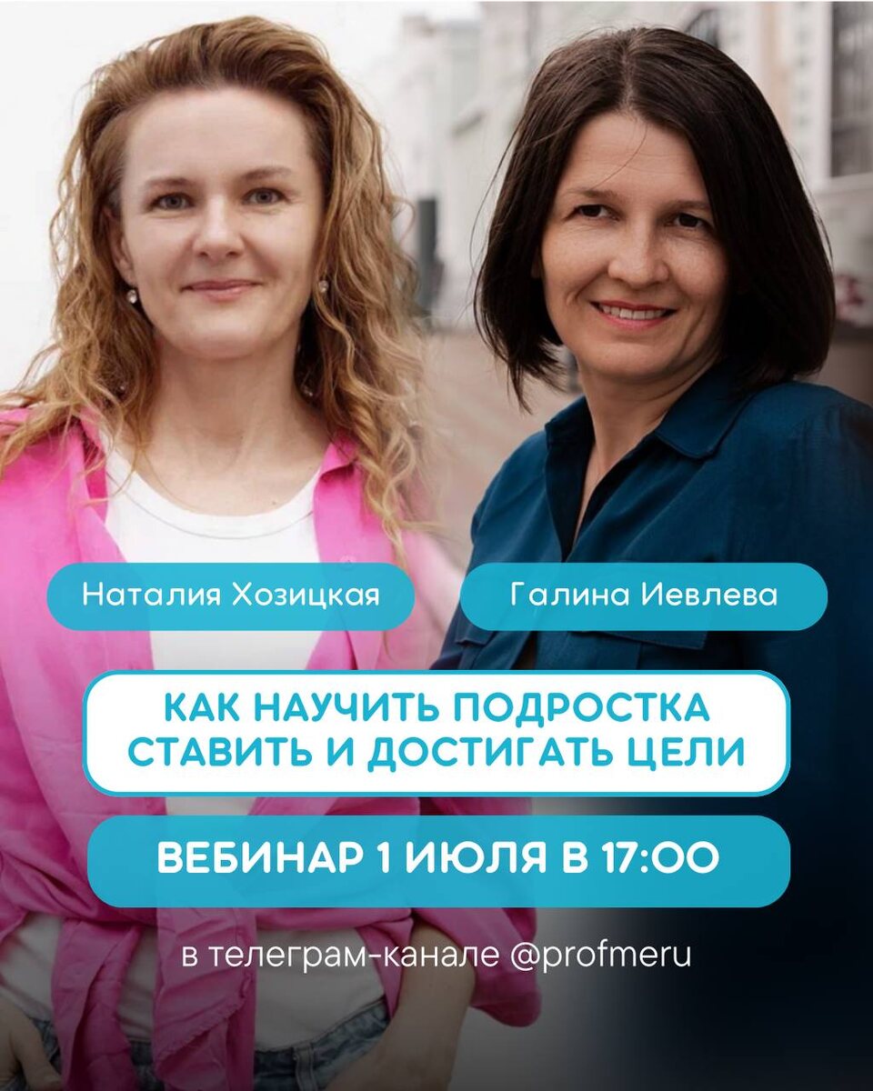 Как научить подростка ставить и достигать цели, не придумывая за него💡 Вебинар 1 июля в 17:00⏰ Во взрослой жизни успех — в карьере, бизнесе или личных замыслах — часто зависит от умения ставить цели, планировать их достижение и действовать последовательно. Такие навыки можно и нужно формировать уже в подростковом возрасте. Лучше делать это в семье, не надеясь, что научит школа, институт или работа. В планировании и достижении целей помогут привычки. Считается, что сила привычки помогает двигаться к целями без героических усилий и напряжения всей силы воли. ➡️ О том, как помогать подросткам ставить собственные цели и формировать правильные привычки поговорим на вебинаре 1 июля в 17:00 по МСК. ⚪️В гостях у ProfMe Галина Иевлева — предприниматель с 25-летним стажем, мать троих детей, коуч, бизнес-тренер, создатель собственной Мастерской достижения целей, а также автор книг и курсов по целям, привычкам и продуктивности. Актуальные вопросы принимает и задает нашей гостье Наталия Хозицк
