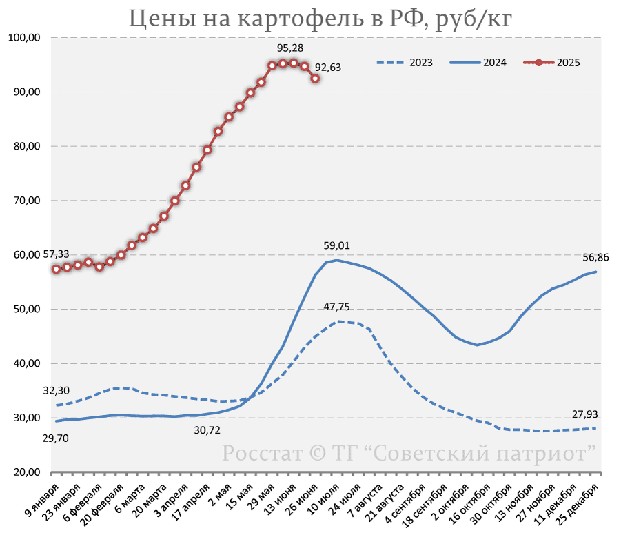 Однако, если взглянуть на официальные данные Росстата, то можно увидеть, что цены 2 года назад на картофель были в 2 раза ниже нынешних -- 45 рублей за кило против 93: