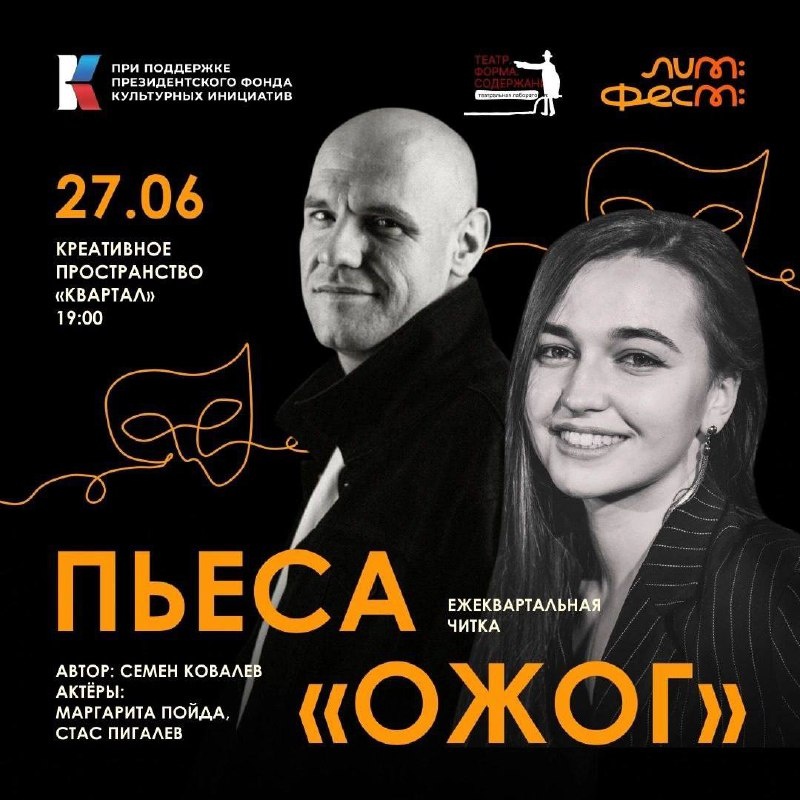 Ежеквартальная читка от лаборатории Театр.Форма.Содержание. 🗓️ 27 июня, 19:00 📍Квартал, Ленина 78 Автор пьесы «Ожог» — Семён Ковалёв В ролях: Маргарита Пойда и Стас Пигалёв Он вспоминает первую любовь. Первую потерю. И тот момент, когда становится ясно: ожог — это не всегда про кожу. «Ожог» — пьеса, выросшая из киносценария и вошедшая в шорт-лист конкурса молодых драматургов «Вне Dramы». Тонкая, горькая история о близости, которая больнее разлуки. О том, как чувства не стираются, а выжигают след. Будет камерно. Будет про каждого. Вход свободный 🏷️ #27июня25