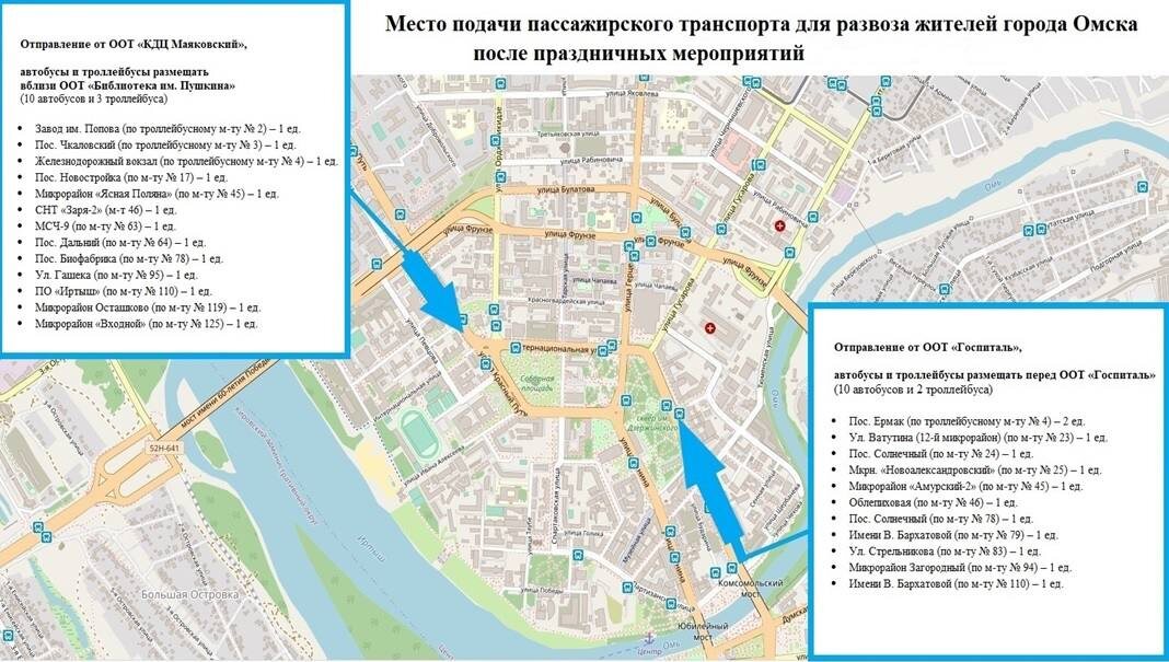 27 июня в 22:15 и 28 июня в 22:45 на остановках «Библиотека им. Пушкина» и «Госпиталь» будут отправлены 20 автобусов и 5 троллейбусов.
