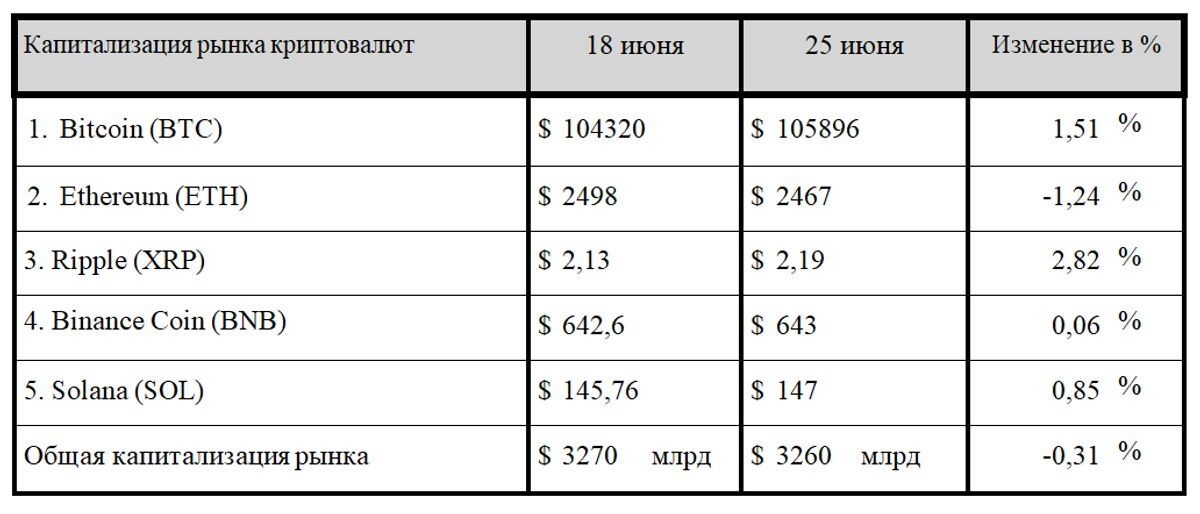 По итогам минувшего семидневного отчетного периода общая капитализация криптовалютного рынка уверенно удержала психологическую отметку в $3 млрд. На вечер среды, 25 июня 2025 года, она составила $3,26 трлн, что на едва заметные 0,31% ниже значений, зафиксированных на конец прошлого отчетного периода.