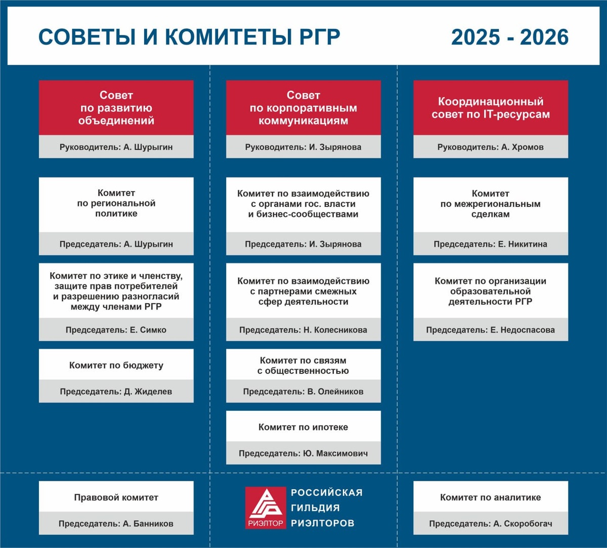 На состоявшемся в Архангельске Национальном совете Российской гильдии риэлторов были сформированы комитеты РГР на 2025–2026 годы, а также избраны их председатели. В текущем периоде в структуре РГР функционирует 11 комитетов, которые распределены в советы по развитию различных направлений деятельности: Совет по развитию объединений под руководством Артемия Шурыгина включает: 🟡 Комитет по региональной политике. Председатель: Артемий Шурыгин 🟡 Комитет по этике и членству, защите прав потребителей и разрешению разногласий между членами РГР. Председатель: Елена Симко 🟡 Комитет по бюджету. Председатель: Дмитрий Жиделев Совет по корпоративным коммуникациям под руководством Ирины Зыряновой включает: 🟡 Комитет по взаимодействию с органами государственной власти и бизнес-сообществами. Председатель: Ирина Зырянова 🟡 Комитет по взаимодействию с партнерами смежных сфер деятельности. Председатель: Наталия Колесникова 🟡 Комитет по связям с общественностью. Председатель: Василий Олейник