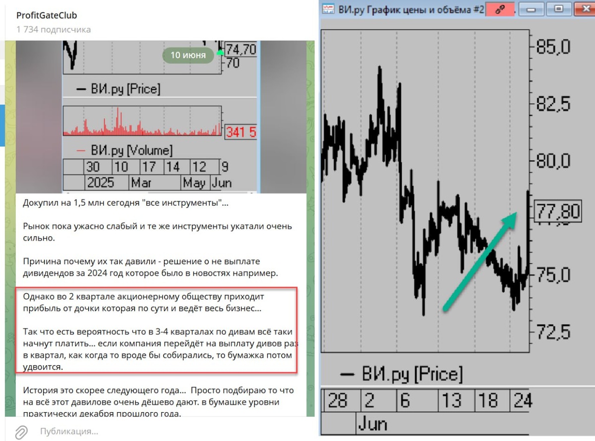 ☝️Вспоминаем мой пост от 10 июня вам... С докупкой Все инструменты по 74 с копейками рублей... С утра бумага растёт более 3%. Читаем новость: "ООО «ВсеИнструменты.ру» выплатит дивиденды на 525 млн руб. Об этом говорится в сообщении компании. Решение принято единственным участником — ПАО «ВИ.ру». Напомним, ранее стало известно, что ПАО «ВИ.ру» по итогам 2024 года дивиденды не будет выплачивать. "