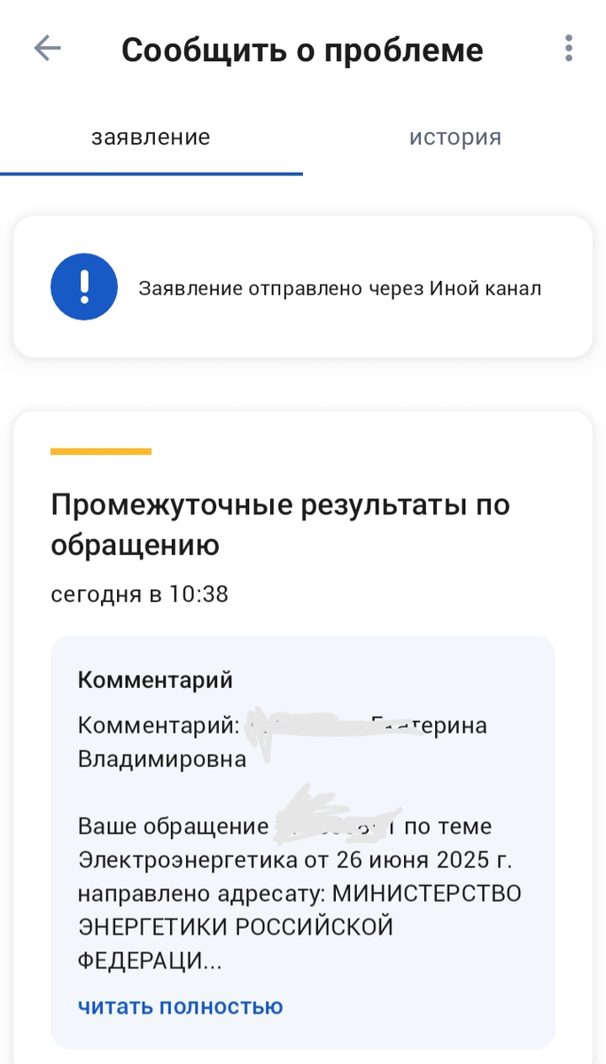 Я не стала жаловаться в бесполезную бездну Россети, а сразу написала жалобу в Минэнерго России. Зарегистрировали через Госуслуги. Ждать решения 30 суток. Ну что ж подожду...