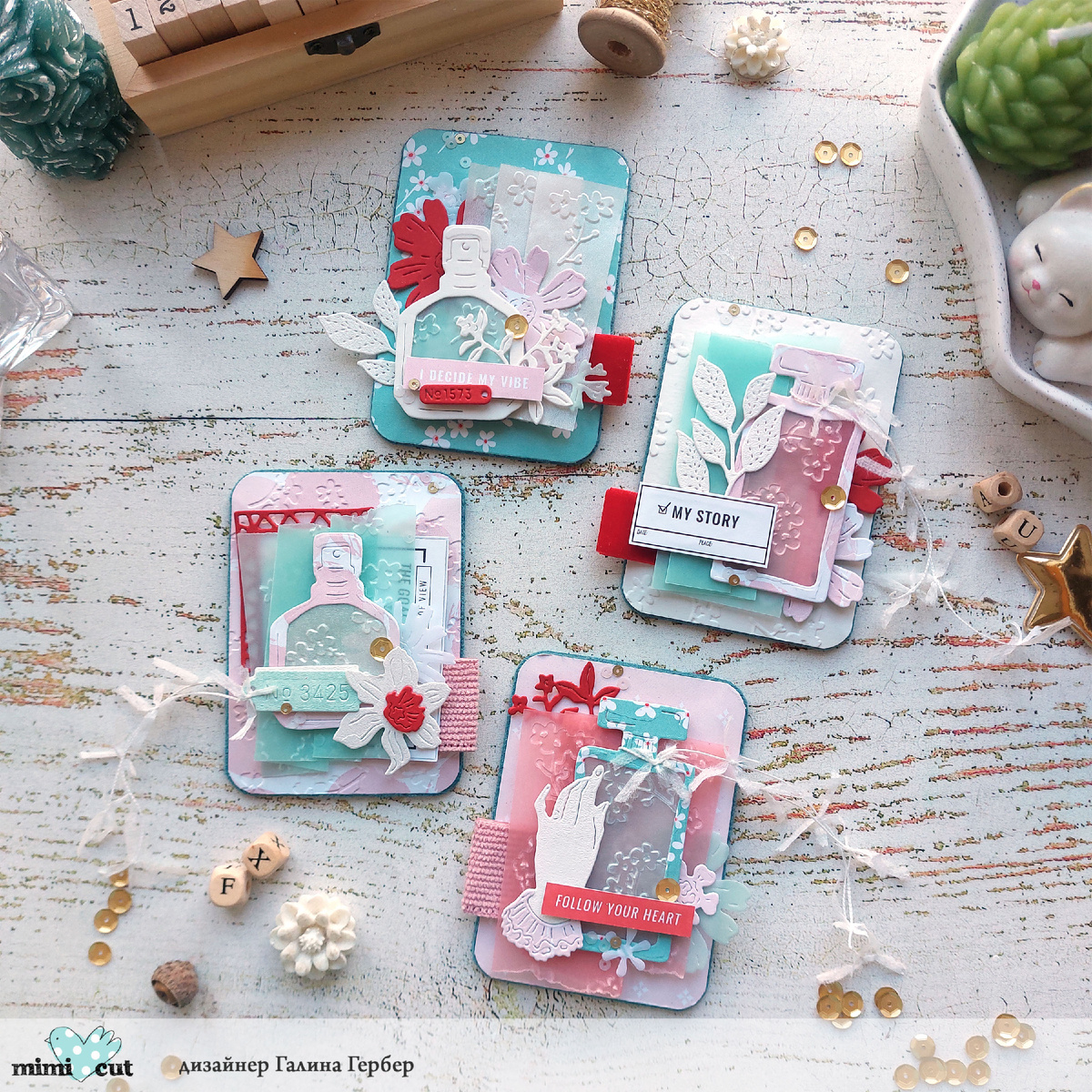 Как пахнут незабудки? Никогда не думала об этом. Может быть сладостью и мёдом? Или свежим летним ветерком? А может солнечным теплом и упоительной прохладой утренней росы? Сегодня я, Галя Гербер, как настоящий парфюмер, создала для вас серию незабываемых ароматов. Главным ингредиентом моих флакончиков, т.е. карточек АТС, стала папка для тиснения с незабудками. Эффект легкости и невесомости помогла создать калька. За красивую упаковку отвечает сет "Летучий пленник, запертый в стекле". Любые духи - сложные смеси. К своим ароматам я добавила следующие составляющие: "Космеи скромные цветы", "Привет, ромашки", "Вершки и корешки", "Дай мне руку", "Лето в кармане", "Слайд-шоу", "Каракули". Всем любви, тепла и вдохновения! До скорых встреч, ваша мимиптичка Галя!