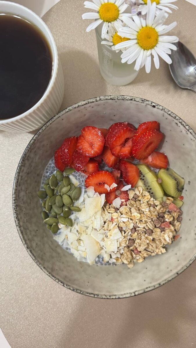 Я дома и возвращается рубрика что я ем! Когда хочется сладкий завтрак. Боул с чиа, фруктами и ягодами. Но не смотря на это он сбалансирован и вкусен: ✅семена чиа в кокосовом молоке ✅семечки тыквы ✅гранола ✅клубника ✅киви ✅кокосовые чипсы ✅черный кофе #завтрак #чтояем