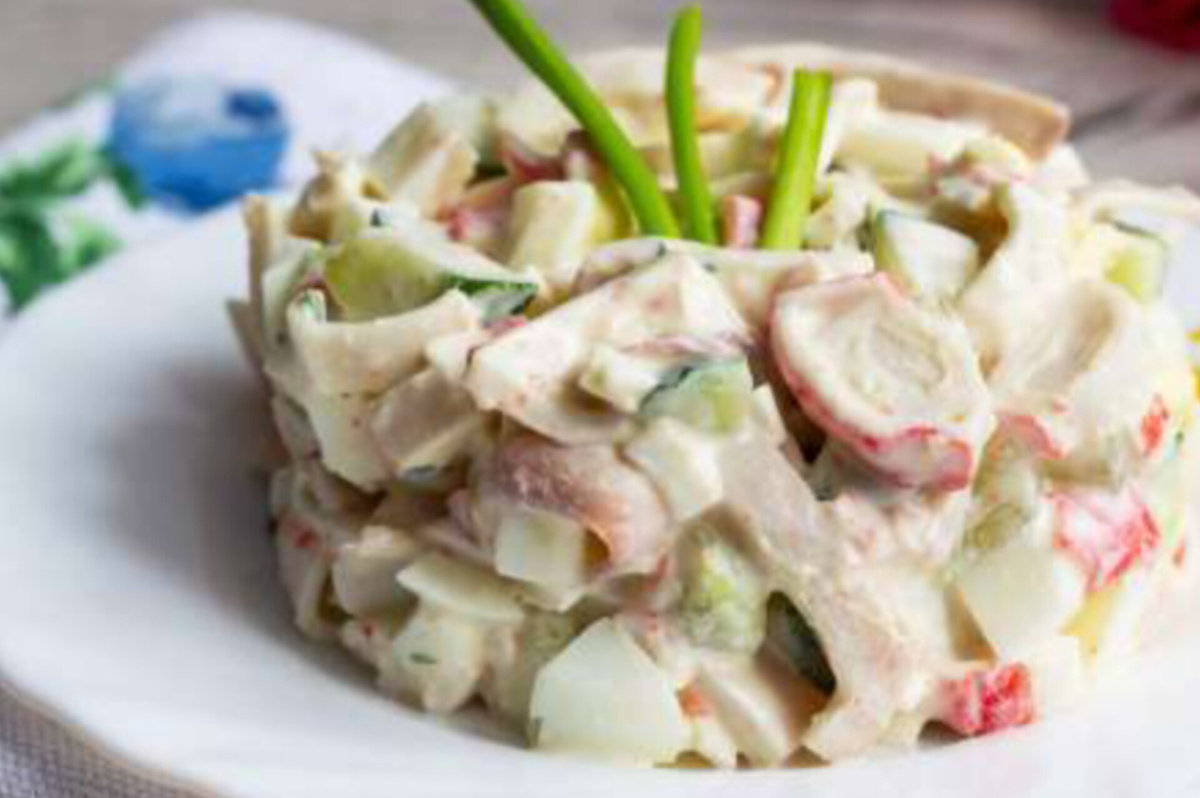 Крабовые палочки нарезать колечками, а кальмары соломкой.