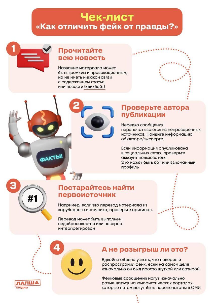 Как не стать жертвой фейков? Новости с кричащими заголовками в соцсетях появляются мгновенно, но что насчет их достоверности? Один неосторожный репост — и ты уже участвуешь в распространении дезинформации. В чек-листе собраны простые и работающие способы проверить информацию, прежде чем ей верить или делиться: 🟥Как отличить настоящий сайт от подделки; 🟥Почему эмоциональные заголовки — это красный флаг; 🟥Как комментарии могут помочь распознать обман; 🟥Куда обратиться, если все еще сомневаешься? Это реальные инструменты, которые помогут тебе оставаться в курсе событий и не попадать в неловкие ситуации. Проверь себя — знаешь ли ты все эти методы? «ДОН 24»
