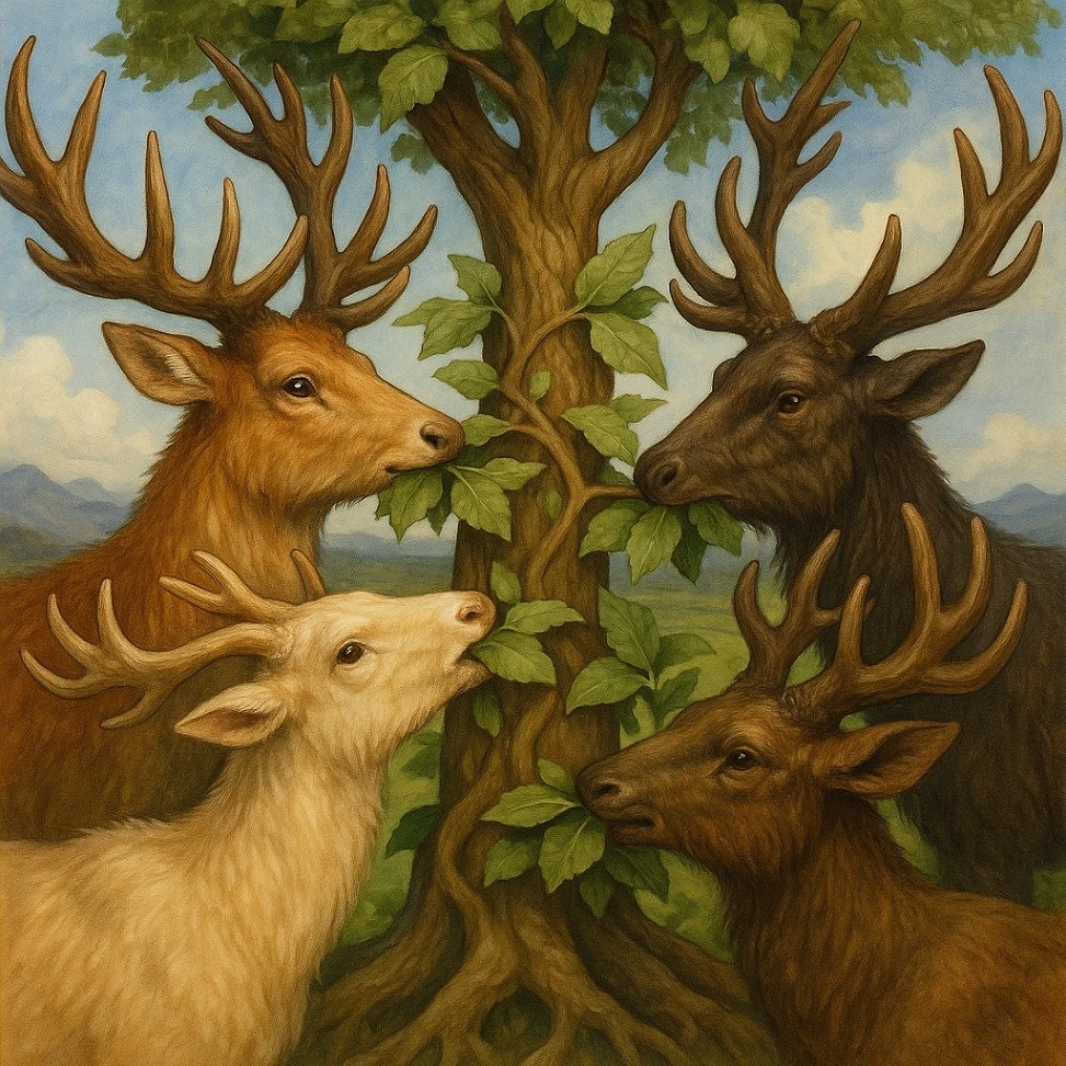 Олени — микробиом мирового дерева. Их рога — грибницы, зубы — ферменты. Они ускоряют гниение старого, чтобы пустить сок в новые побеги.