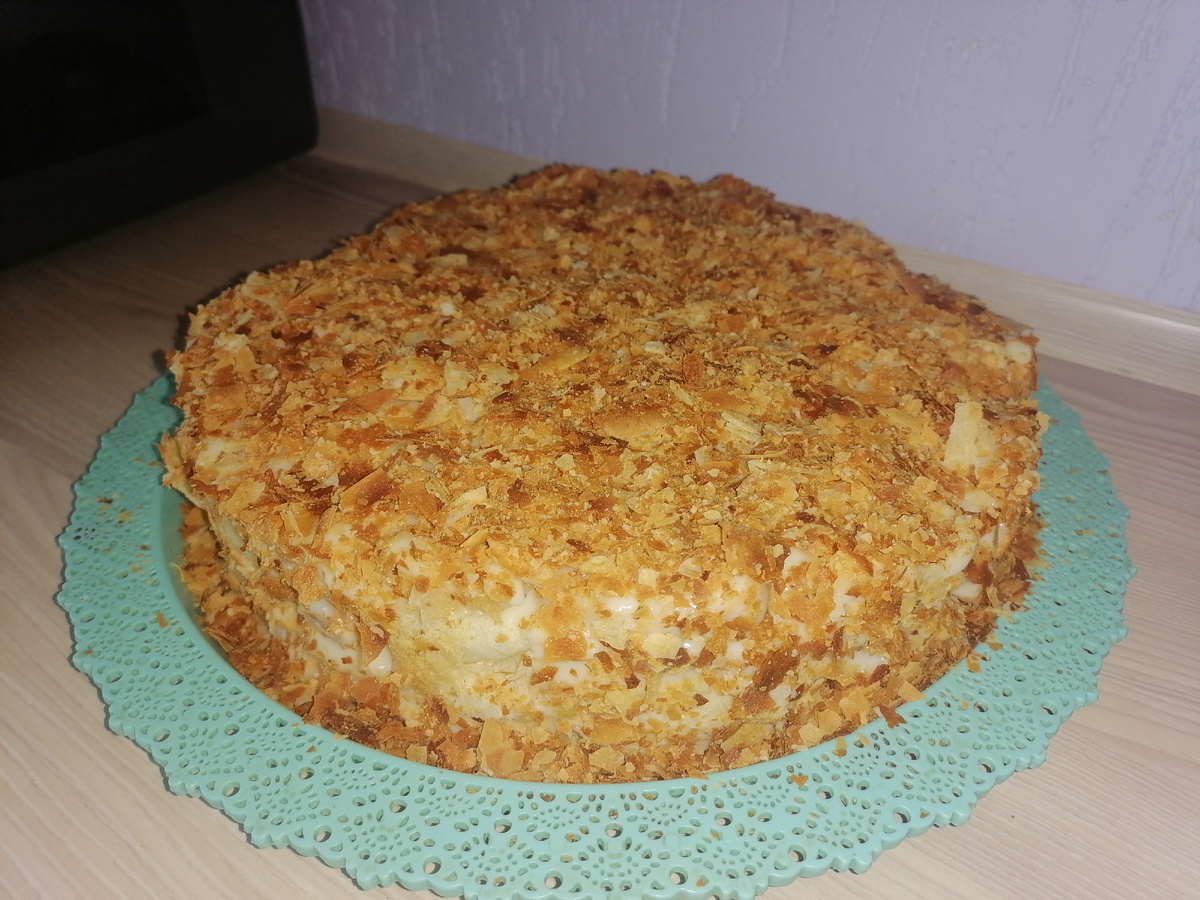 Наполеон из слоёного теста с заварным кремом-этот десерт порадует вас своим нежным вкусом и хрустящей корочкой! Ингредиенты Для теста: - 800г покупного слоёного теста (мы же готовим ленивый Наполеон)) Для заварного крема: - 1 литр молока - 3 яйца - 1 ст. сахара - 7 ст. ложек муки - 1 ванильный сахар (по желанию) - 100 г сливочного масла Приготовление Подготовка теста: 1. Разогрейте духовку до 200°C. 2. Тесто нарежие на квадратики (например, 5x5 см) и выложите их на противень, покрытый пергаментом. 3. Выпекайте в разогретой духовке около 15–20 минут до золотистого цвета. Дайте остыть. 4. С теста снимите самую зажаристую часть. Она пойдет для посыпки торта. 5. Каждый квадратик разделите на 2 части. Приготовление заварного крема: 1. В кастрюлю с толстым дном налейте молоко . 2. Добавьте яйца,сахар, муку. Хорошо перемешайте до образования однородной массы. 3. Кастрюлю поставьте на средний огнь, постоянно помешивая доведите до загустения. 4. Снимите с огня и добавьте сливочное