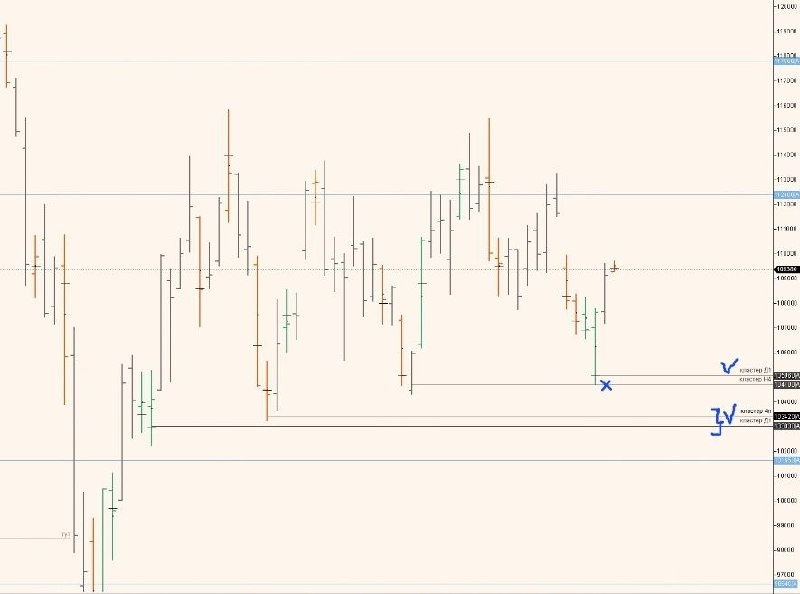 График Ри, дневной тф. Убрал все закрытые кластера кроме того что заврыли вчера - уж очень показательная картинка точки разворота, так работают кластера. Галочкой отметил те что являются сейчас целями, мы их закроем тоже. Не ИИР