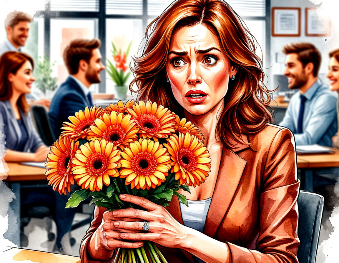 Но спрятаться не удалось. Через пять минут к ней подошла Марина из бухгалтерии с букетом гербер.
