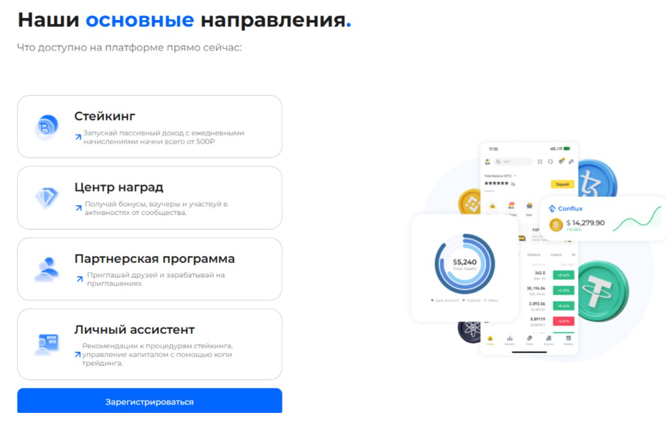Conflux Invest — это не типичная криптобиржа с терминалами, графиками и спредами. Проект позиционируется как инвестиционная платформа для пассивного дохода через стейкинг, бонусные награды и партнерскую программу. Но за яркими обещаниями скрываются тревожные детали. Разберемся, стоит ли доверять этому проекту. ✅ Кстати, проверенный метод заработка здесь◀️ На сайте confluxinvest.ru говорится, что каждый желающий может зарабатывать на стейкинге криптовалют, получать бонусы, пользоваться помощью «личного ассистента» и участвовать в реферальной программе. Чтобы начать, нужно: После этого открывается доступ ко всем функциям платформы. Но тут и начинаются вопросы. 🔍 Нет информации о доходности. На сайте нет конкретных цифр, примеров начислений или таблиц по ставкам. Всё скрыто за обязательной регистрацией. 💳 Отсутствие прозрачности по пополнению и выводу. Неясно, как пополнять счёт или выводить заработанное. Упоминается привязка банковской карты, но больше никаких подробностей. 📜 Лицензия