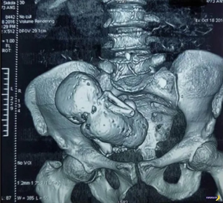 В её теле лежал скелет ребёнка. Оказалось, это литопедион — «каменный ребёнок». Такое бывает, если плод погибает во время внематочной беременности и остаётся в брюшной полости. Организм не может его удалить, но чтобы не началось заражение, покрывает останки кальцием, превращая в камень. Этот плод был в её теле более 30 лет, и всё это время она жила, не подозревая о нём. В мире описано всего около 300 подобных случаев.