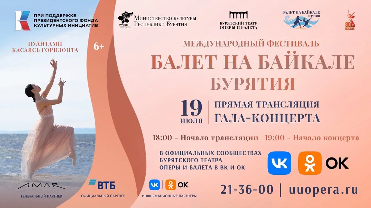 19 июля в сообществах Бурятского театра оперы и балета в социальных сетях ВКонтакте и Одноклассники состоится прямая трансляция гала-концерта Международного фестиваля «Балет на Байкале. Бурятия», который в этом году получил поддержку Президентского фонда культурных инициатив. Это уже стало доброй традицией, что зрители могут посмотреть концерт онлайн. Начало движений в 17:30, трансляция с интервью с организаторами, партнерами и участниками начнется в 18:00, а сам концерт с 19:00. Трансляция будет доступна к просмотру в течение недели, после чего доступ будет закрыт. Гала-концерт «Балет на Байкале. Бурятия» — это одно из самых красивых и ожидаемых мероприятий лета на берегу Священного озера. На фоне заката, под шум волн для зрителей выступят звёзды российского балета, ведущие солисты Бурятского государственного академического театра оперы и балета, артисты из ведущих театров страны, Китая и Монголии. В программе концерта -номера классической и современной хореографии. В этот день в каче
