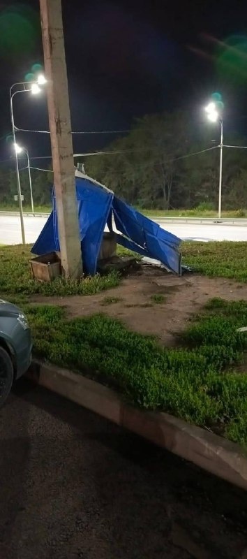 Вчера вечером на конечной остановке улицы Антоново-Овсеенко произошел инцидент со взрывом биотуалета. Трое мужчин запечатлели последствия своего поступка перед тем как покинуть место происшествия на автомобиле Mercedes.