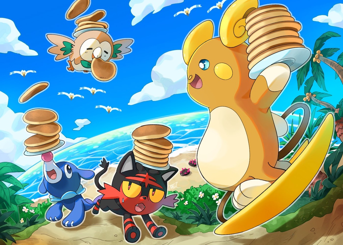 🎨 Художник: mobbbt @PokePikaProject ✏️ Теги: #=_= #alolan_raichu #animal_focus #beach #bird #blue_eyes #blue_sky #cat #cloud #colored_sclera #commentary_request #day #fangs #floating #flying #food #food_in_mouth #grass #holding #holding_plate #horizon #leaf #litten #mobbbt #no_humans #open_mouth #outdoors #outline #palm_tree #pancake #pancake_stack #plate #pokemon #pokemon_(creature) #pokemon_focus #popplio #pyukumuku #rowlet #sand #sky #smile #starter_pokemon_trio #sweatdrop #tree #water #wingull #yellow_sclera