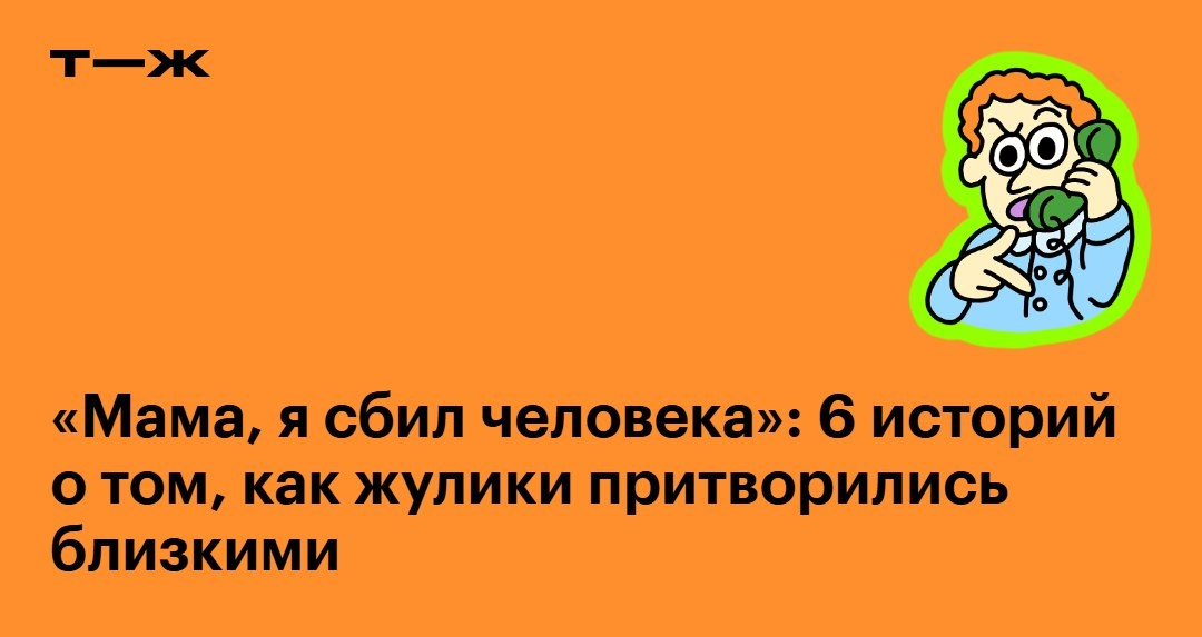 🧔🏻♂️ Сказали, что я без сознания, в тяжелом состоянии, а деньги нужны на взятку, так как отец — виновник аварии. В итоге бабушка пошла на работу, чтобы взять деньги из кассы, но спасло то, что охранник не пустил на территорию рынка, было часов пять утра. 👩🏻🦳 «Нет, нет, ты не так услышала, бабуля — это меня сбили, лежу с пробитой головой, а за рулем был депутат, и мне теперь грозит уголовка за то, что я попала под машину депутата». Потрясающе звучит, но именно так они и сказали бабушке. 👱🏻♂️ Ночью раздался звонок. Голос в трубке прохрипел: «Мама, беда». Мама спросила, кто это. Голос ответил, что Данил. Это действительно было имя брата. Тут мама пошла к нему в комнату и позвала к телефону. Он спросил: «Ты Данил?» — «Да». — «А я тогда кто?» По ссылке — эти и другие истории читателей, чьим близким звонили мошенники: https://t-j.ru/tg/imitation-relatives-fraud/