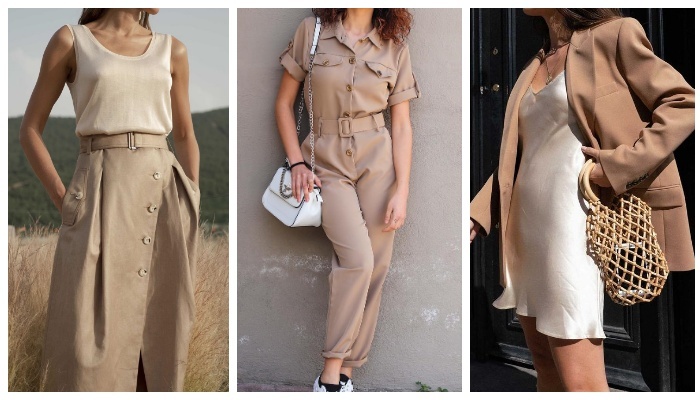 Бежевый цвет — это основа, которая должна быть в гардеробе каждой представительницы современной моды. Сейчас мы разберём несколько примеров того, как можно стильно одеться летом, выбрав одежду в бежевых оттенках. Первый летний образ представляет собой ансамбль, состоящий из сарафана на тонких бретелях в бежевой гамме, дополненного сандалиями на плоской подошве с изящными перемычками белого цвета. Завершает образ каркасный клатч с акцентными яркими деталями. В этом образе оверсайз бежевое платье-рубашка гармонично смотрится с черным ремнем, коричневыми сандалиями и кожаной плетеной сумкой. Бежевый монохром в летнее время года может выглядеть следующим образом: хлопковая майка в минималистичном исполнении + макси бежевая юбка на запах с выразительными пуговицами и карманами. На этот раз стильный аутфит получился благодаря сочетанию бежевого комбинезона с черно-белыми кроссовками и белым кожаным клатчем на длинной цепи. Еще один стильный образ, который подойдет на каждый день получился бл