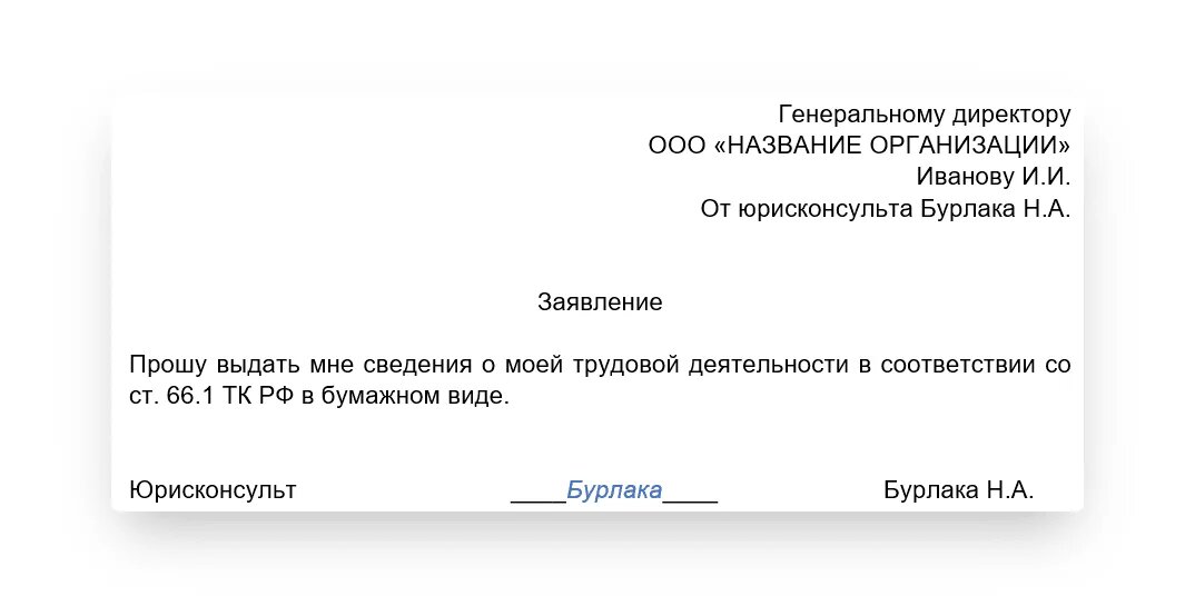 - дату, когда подано заявление о предоставлении сведений о трудовой деятельности — в формате ДД.ММ.ГГ.