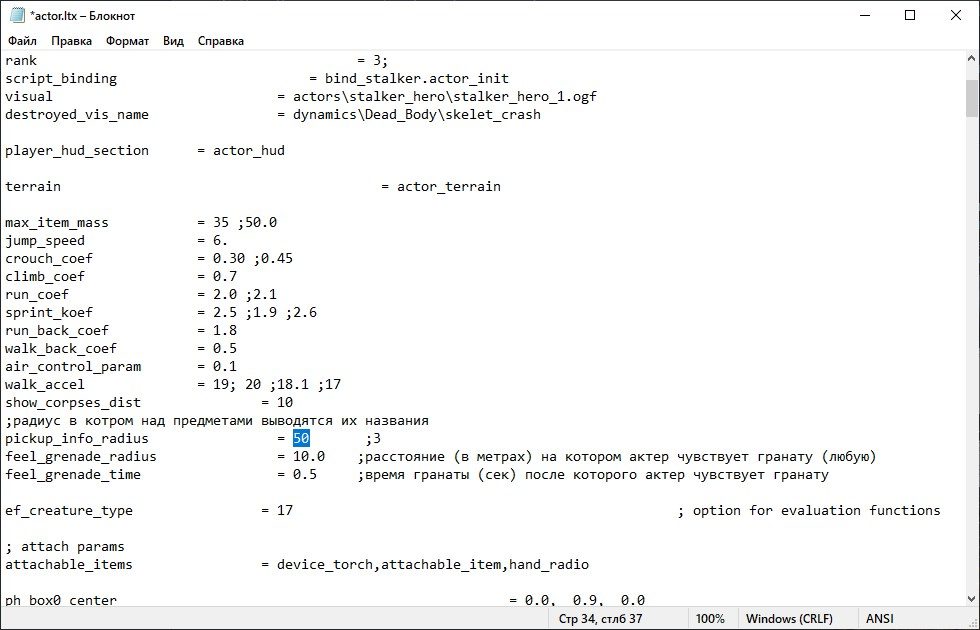 Многим нужен файл актор из игры сталкер зов припять для того чтоб изменить груз рюкзака ака переносимый вес (ноша кг.) для того чтоб таскать с собой много стволов и консерв). В файле configs\creatures\actor.ltx меняем значения: