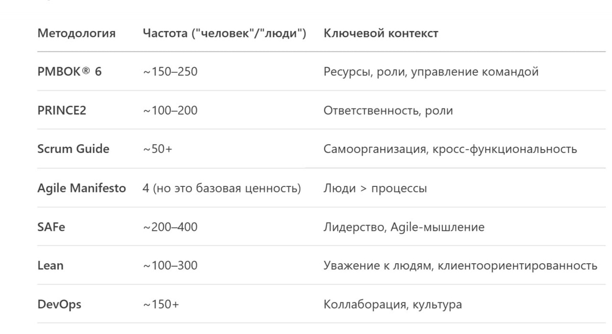 А с чего вообще появился Проектный спецназ? Лет 20 назад я всерьез заинтересовался всеми известными фреймворками/методологиями/подходами проектного управления. Прям вгрызся в них. И испытал реальный шок. Ни в одном из них не говориться о главном. О человеке. Там было обо всем. О целях, планах, результатах, проектах, рисках и много еще о чем. Но про человека не было почти ничего. И это меня очень удивило. Как же так? Ведь человек делает проект. И для человека делается проект. И это побудило меня примерно 15 лет назад заняться созданием подхода, который вы все знаете теперь под названием Проектный спецназ. Там главное - человек. Со всеми своими сложностями, страхами, страстями и многим другим. Но об этом поподробнее попозже как нибудь расскажу. А сейчас хочется привести факты. На фото данные, которые выгреб DeepSeek из всех ключевых фреймворков. Упоминания слова "человек" и около того - всего пару сотен в каждом из них. Пару сотен слов на например 800 страница PMBok. Как вам