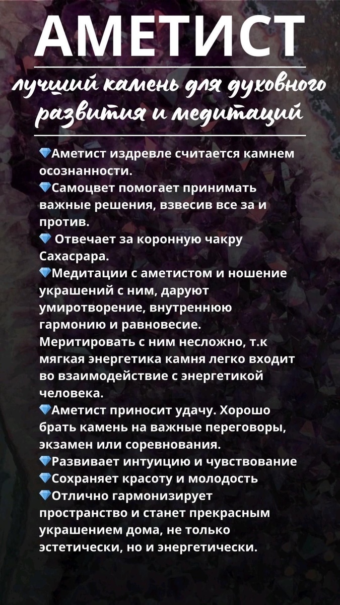 🔵5. Если медитировать в близости с аметистом, будет легче достичь покоя и проникнуть в понимание информации свыше.