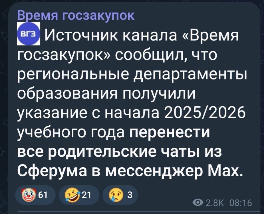 Не нытьем, так катаньем. Не "Сферум", так МАХ. И опять без правовой основы.👇 Ну, собственно, разговоры о необходимости и "обязательности" перевода всех в МАКС говорили на совещаниях еще в июне, после подписания соответствующего Указа Президента. Вопрос только в том, что не существует ни одного нормативного документа, который обязывает школы вообще иметь подобные чаты. Как и корпоративные чаты, кстати - тоже. Так что я вообще не понимаю правовую основу требований "перейти" в МАКС.
