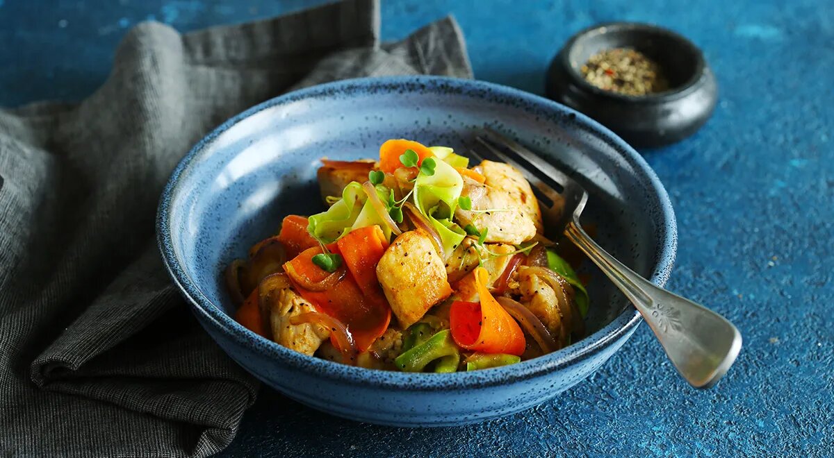Это простое и быстрое блюдо станет отличным выбором для тех, кто хочет вкусно и полезно поесть. Оно идеально подходит для ужинов или обедов, особенно если хочется насытиться белком и витаминами, сохранив фигуру стройной. 1. Подготовьте ингредиенты Филе куриной грудки нарежьте крупными кубиками размером примерно 3 сантиметра каждый. Присыпьте их солью и чёрным перцем. 2. Нарежьте овощи Почистите и мелко нарежьте чеснок и красный лук. Затем подготовьте кабачок и морковь, нарезав их длинными полосками (например, при помощи специального ножа). 3. Начнём жарить! Разогрейте глубокую сковороду на большом огне и добавьте оливковое масло. Когда масло разогреется, отправляйте туда кусочки куриного филе. Жарить следует всего лишь несколько минут: сначала одну сторону — около двух минут, потом перевернуть и ещё минуту подержать. Важно: курочка должна оставаться слегка розоватой внутри, иначе получится суховато. Вытащите её шумовкой и отложите на отдельную тарелку. 4. Продолжаем процесс Теперь в т