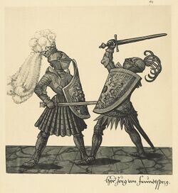 Пеший поединок на мечах. Гравюра из турнирной книги императора Максимилиана I «Фрейдал». 1512—1515 гг.