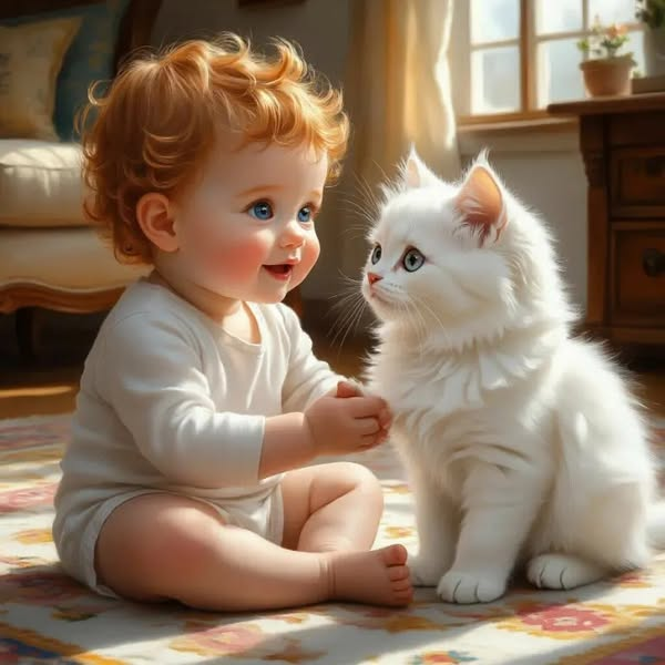 маленький белоснежный котёнок по имени Эльза. Малыш Адам, рыжеволосый и голубоглазый,