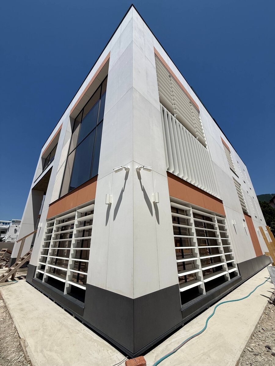 На южных берегах фасад приводим в соответствие с проектом - развесили наружное освещение и установили камеры