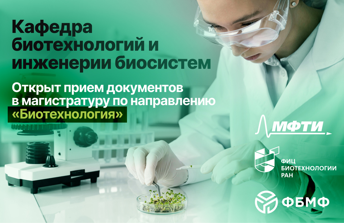 Открыт прием документов на направление магистратуры «Биотехнология» Кафедры биотехнологий и инженерии биосистем МФТИ, которая в этом году открылась на базе ФИЦ Биотехнологий РАН – одного из ведущих научных центров страны в области прикладных и фундаментальных биотехнологий.