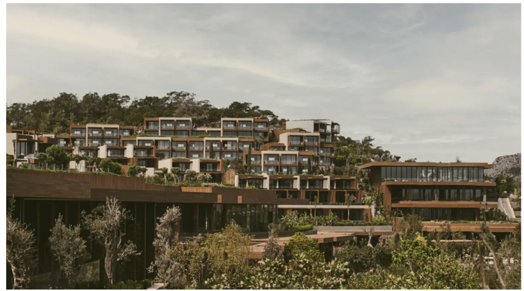 Отель спроектирован архитектором Махмутом Анларом как ансамбль из 23 вилл и 259 номеров, гармонично вписанных в холмистый ландшафт. Террасы с видами на Эгейское море, оливковые рощи и лабиринты из кипарисов создают атмосферу приватности. Для перемещения по территории доступны гольф-кары по вызову через приложение или личного ассистента.