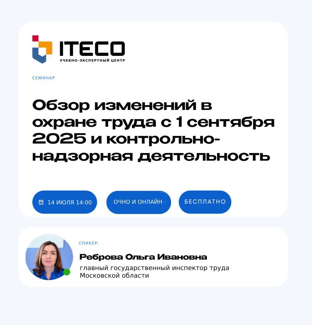 #Семинары ⚡️ С 1 сентября 2025 года вступит в силу новый перечень профзаболеваний, порядок экспертизы профпригодности работников, изменятся особенности проведения СОУТ для ряда категорий работников, а также формы медицинских заключений для расследования НС. Это не полный перечень изменений. Чтобы подготовиться к нововведениям, приходите к нам на семинар по теме: «Обзор изменений в охране труда с 1 сентября 2025 и контрольно-надзорная деятельность». 🗓 Старт: 14 июля в 14:00 📢 Формат: очно и онлайн 💳 Стоимость: бесплатно 📍 Адрес: Московская область, г. Подольск, ул. Комсомольская, д. 28, стр. 2, 5 этаж, аудитория 506 (БЦ «Пассаж») Спикер: ⭐️ Реброва Ольга Ивановна — главный государственный инспектор труда Московской области 🔗 Записаться