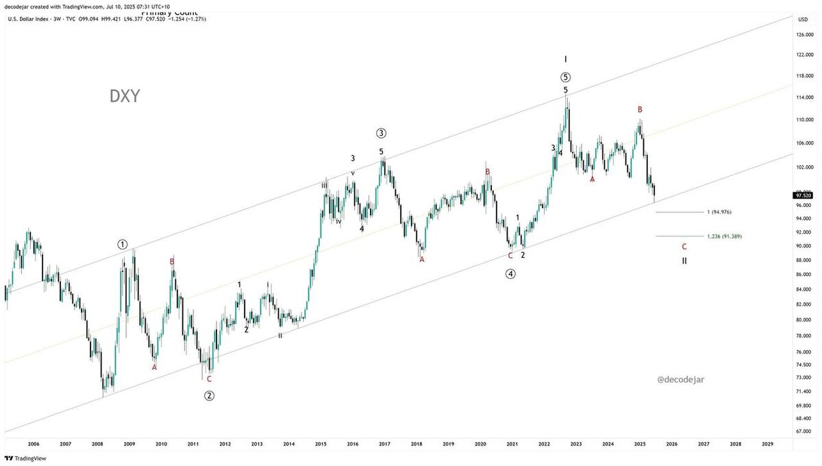 DXY у границы 15-летнего канала. Если пробьёт — ждите тектонических сдвигов Индекс доллара (DXY) подошёл к нижней границе трендового канала, который держится с 2008 года. Это не просто уровень поддержки — это фундаментальный водораздел. Если канал устоит — увидим отскок и консолидацию. Но если пробьёт — нас ждёт полноценный слом долларовой гегемонии. И вот почему это важно: 1. DXY = зеркало глобального доверия к доллару. Падение ниже 95 — сигнал, что мир начал отказываться от доллара как якорной валюты. 2. Следующая цель по технике — район 91.3. Это не просто цифра. Это уровень, где доллар теряет лицо: для EM (развивающиеся рынки) это означает валютный хаос, для сырьевых рынков — всплеск спроса, для крипты — окно возможностей. 3. Почему это происходит? Сочетание фундаментальных сдвигов: рост дефицита, снижение реальных ставок, попытки дедолларизации и политическая нестабильность в США. Всё это подрывает доверие к доллару — особенно у глобального юга. 4. Пока не сломлен, но… Даже