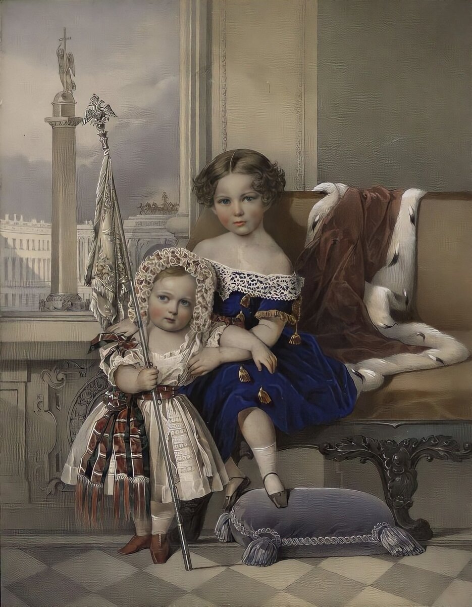 Казалось бы, что может быть «военно-исторического» на портрете совсем маленьких представителей императорской фамилии, еще фактически не вышедших из младенческого возраста и позирующих (независимо от пола) в детских платьицах? Оказывается, может. На портрете В.И. Гау, послужившем основой для литографии Шмида и Андерсена, экземпляр которой хранится в Государственном историческом музее, изображены старшие дети императора, а тогда еще Цесаревича Александра Николаевича Великий князь Николай Александрович и великая княжна Александра Александровна. Портрет датируется по-разному – 1844, 1845 и даже 1847 гг. Великая княжна Александра Александровна обнимает или, даже скорее, поддерживает стоящего рядом младшего брата. А Николай Александрович сжимает правой ручонкой некую регалию, которая… очень напоминает принятый в соответствующий период образец кавалерийского штандарта. Не вызывает сомнений, что в данном случае перед нами не сам «настоящий» штандарт, а его уменьшенная, «детская» реплика. Но ес