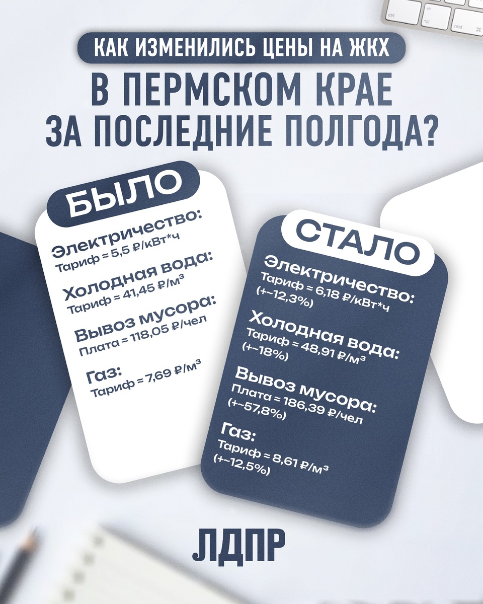 ЖКХ в Пермском крае бьёт рекорды! С июля тарифы выросли на 21,1%, а вместе с ними — и тревога в кошельках жителей. 📊 Немного информации о росте: ТКО: +57,8% Свет: +12,3% Вода, тепло: до +18% ЛДПР никогда не будет на стороне «повышения ради повышения». Призываем всех жителей Пермского края обратить внимание на квитанции за июнь и июль. Если суммарный рост на оплату услуг ЖКУ составит более 21%, немедленно сигнализируйте нам в Пермское региональное отделение ЛДПР! +7(342)246-22-98